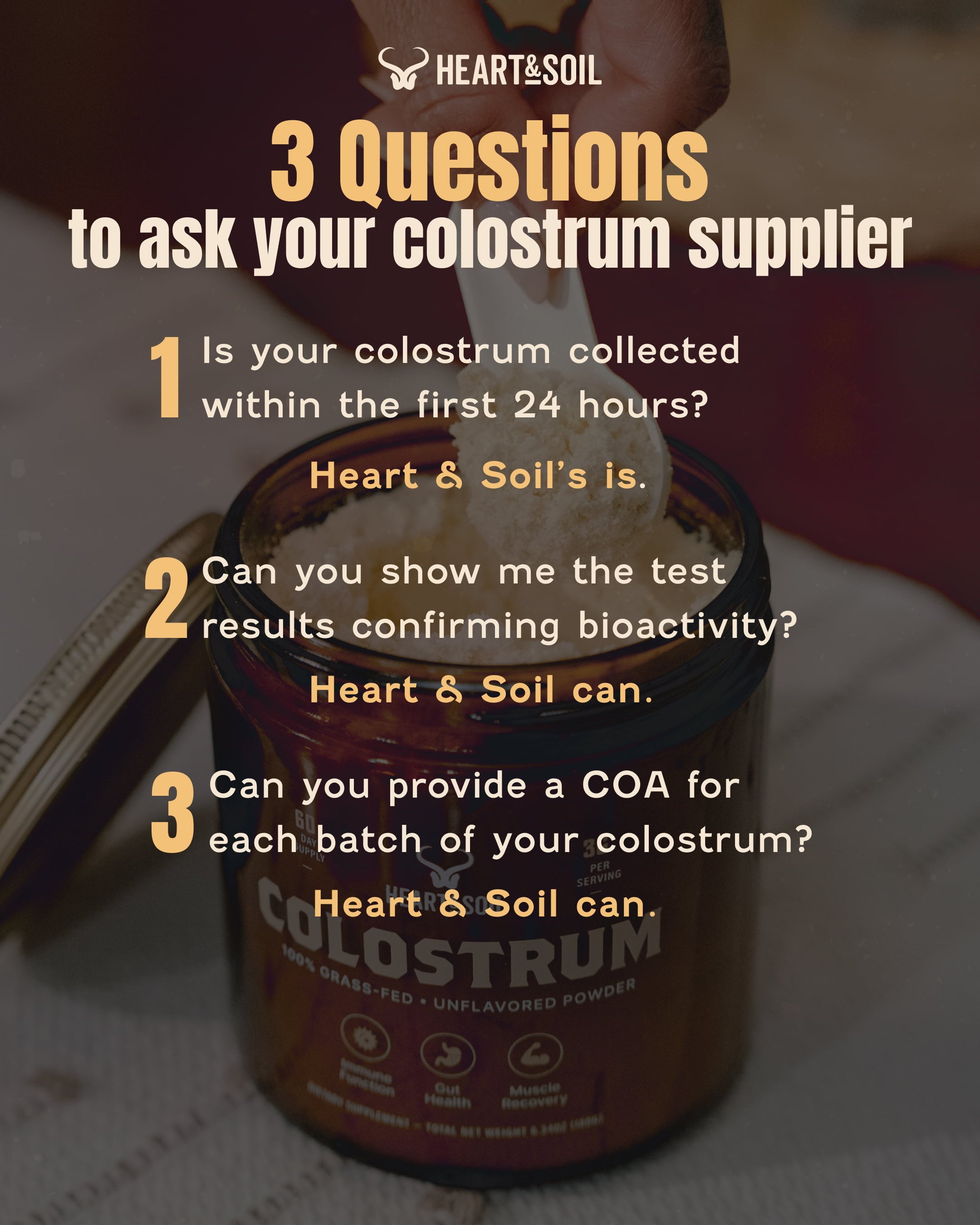 Heart & Soil Grass-Fed Colostrum is as close to raw as the law allows—gently processed from the first milking. Verified for bioactivity through ELISA, HPLC, and RID testing.